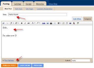 You will soon be in the post editor, where you can write anything as you may have thought about before. (it is recommended to directly write for your first post to avoid "Blogger Anti-Spam Robot" that can result in your blog locked. For instance, you can write a very short entry if you have not prepared an entry: "Hello World!", and anything else you want. Click "PREVIEW" button to view how your post will be displayed, then click "PUBLISH POST" if you want your entry to be published.